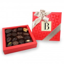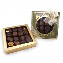 La Bonbonnière vous propose une élégante Boîte Carrée Turquoise Blanc et Or, garnie de seize chocolats traditionnels fourrés. Vous y trouverez un assortiment de petits chocolats Maison, pralinés (amandes, noisettes), ganaches (aux fruits, avec une pointe d’alcool), et pâtes d’amandes enrobés de chocolat lait et noir. Les bonbons de chocolat sont disposés élégamment dans une caissette puis sur un seul niveau, tous ainsi visibles au premier regard. Pour les fêtes, son allure sera rendue plus festive grâce son ruban brillant ! Poids net : Env. 160g.