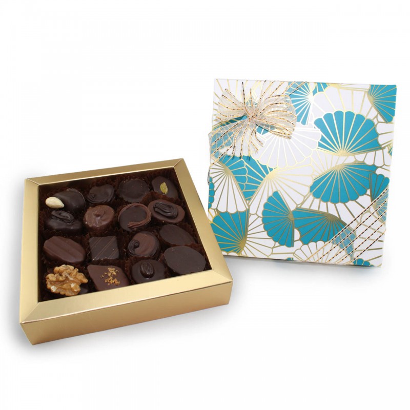 La Bonbonnière vous propose une élégante Boîte Carrée Turquoise Blanc et Or, garnie de seize chocolats traditionnels fourrés. Vous y trouverez un assortiment de petits chocolats Maison, pralinés (amandes, noisettes), ganaches (aux fruits, avec une pointe d’alcool), et pâtes d’amandes enrobés de chocolat lait et noir. Les bonbons de chocolat sont disposés élégamment dans une caissette puis sur un seul niveau, tous ainsi visibles au premier regard. Pour les fêtes, son allure sera rendue plus festive grâce son ruban brillant ! Poids net : Env. 160g.