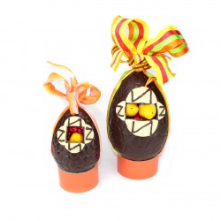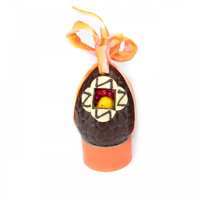 Proposé en chocolat noir et en lait, il est garni, en plus du poussin, de surprises maison et existe en une taille plus grande avec un toit et 2 poussins. Poids net : env. 380g.