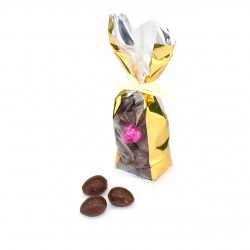 La Bonbonnière vous propose son élégant sachet transparent et ses bandes or, garni de Pralinés de Pâques Maison : essentiellement des œufs praliné, et aussi des coquillages et des cloches praliné. Il est proposé tout lait, tout noir ou mixte.