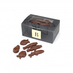 La Bonbonnière vous propose sa jolie boîte de fritures de Pâques, avec sa fenêtre transparente sur le dessus. On aperçoit ainsi ces fameux petits poissons en chocolat lait et/ou noir, aussi simples que délicieux, si typiques des fêtes de Pâques et de la "pêche miraculeuse". En noir, elles sont réalisées avec notre chocolat maison Super Guayaquil à 70% de cacao, particulièrement rond, doux et équilibré, qui plaît aux petits et aux grands !En lait, elles sont élaborées à partir de notre chocolat au lait corsé en cacao (43% de cacao) laissant se développer en fin de dégustation une légère onctuosité rappelant celle du caramel.