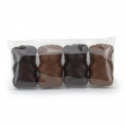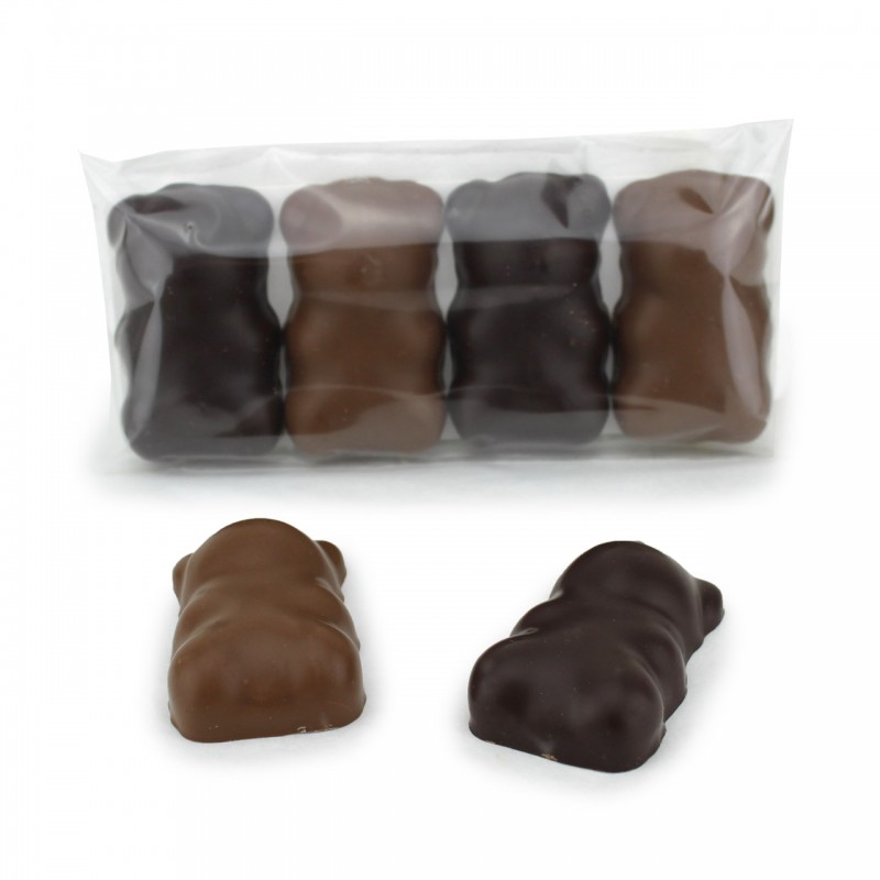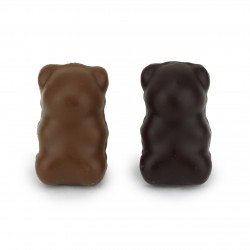 Vous vouliez des Nounours ?!... enfin, les voici ! Excellente guimauve artisanale parfumée à la Vanille Bourbon bio de Madagascar et enrobée chocolat noir 70% ou au lait à 43% de cacao en forme de petits oursons ! Un pur délice gourmand, on adore, on fond ! Ici ils sont proposés en étui de 4 Nounours, tout lait, tout noir ou mixte. Ils existent aussi dans un magnifique étui de 7 très élégant...